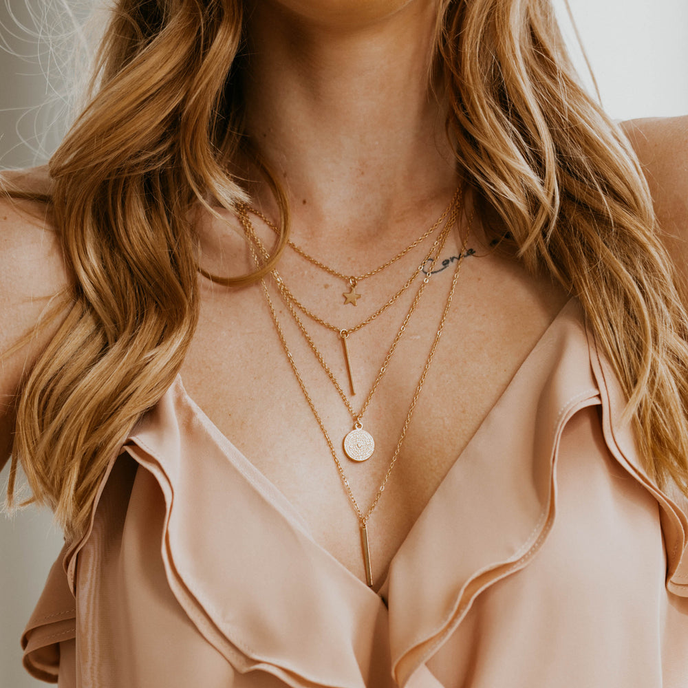 Der Schlüssel zum perfekten Layering ist die Variation der Kettenlängen. Kombiniere kurze, mittellange und lange Ketten, um Tiefe und Dimension zu erzeugen. Dies verhindert, dass die Ketten sich verheddern und sorgt für einen harmonischen Look.
